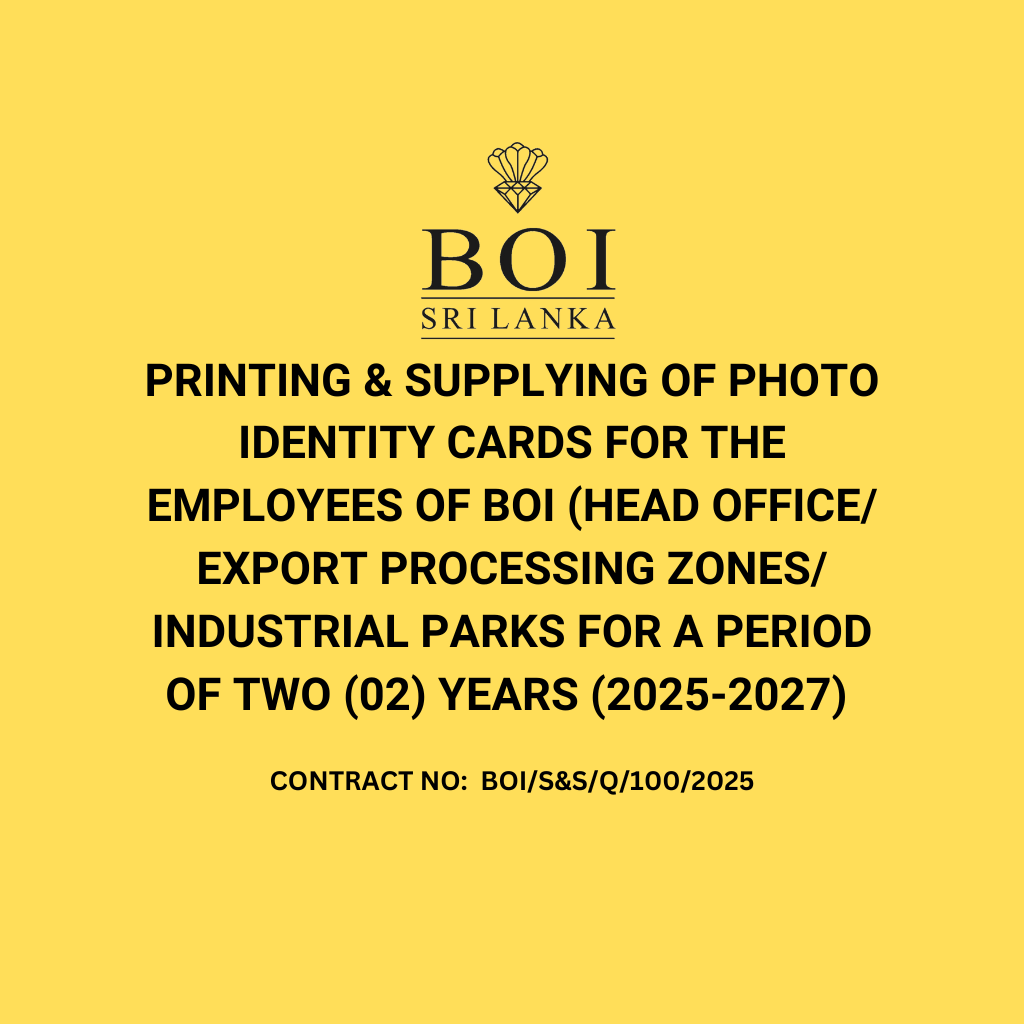 PRINTING & SUPPLYING OF PHOTO IDENTITY CARDS FOR THE EMPLOYEES OF BOI (HEAD OFFICE/ EXPORT PROCESSING ZONES/ INDUSTRIAL PARKS FOR A PERIOD OF TWO (02) YEARS (2025-2027)